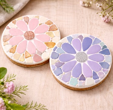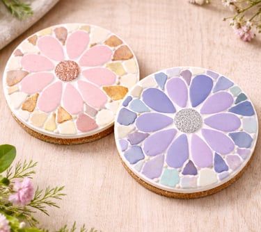 Every participant creates their own set of mosaic coasters using quality bases and a curated range of tiles in complementary colours and finishes. The price includes all materials, grouting, and guidance to achieve a polished result. The finished coasters are durable, functional, and genuinely lovely to use at home.